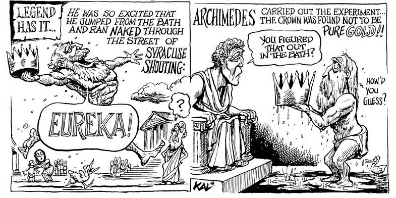 Later that afternoon, he decides it’s time to take a bath. As he lower’s himself into the bath tub, the water overflows. His inner monologue blurts out, “I have it!”. He has found the answer to his problem with an extremely creative solution. By measuring the volume of the crown, from the volume of water displaced, and knowing its mass, he could calculate the density of the crown and compare it with the densities of silver and gold.